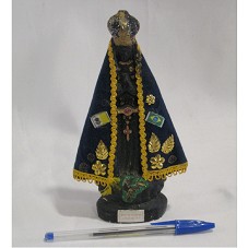 ESCULTURA (19 CM) CONFECCIONADA EM GESSO. IMAGEM DE NOSSA SENHORA APARECIDA, COM MANTO EM VELUDO AZUL MARINHO, ORNADO COM LANTEJOULAS DOURADAS. NA BASE, PAPEL CONTENDO A INSCRIÇÃO 'ESTIVE EM APARECIDA / LEMBREI-ME DE TI'.