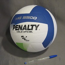 BOLA OFICIAL DE VOLEIBOL, NA COR BRANCA, COM DETALHES EM AZUL E VERDE. POSSUI A INSCRIÇÃO 'MG 5500 / PENALTY / VÔLEI OFICIAL' E LOGOMARCA DA CONFEDERAÇÃO BRASILEIRA DE VÔLEI.