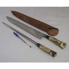 CONJUNTO DE FACA (44 CM) E CHAIRA (AFIADOR) (41 CM), COM OS CABOS EM OSSO E DETALHES EM PRETO E A LÂMINA DA FACA EM AÇO. ACONDICIONADOS EM BAINHA FEITA EM COURO.