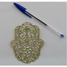 PLACA (10X8 CM) REPRESENTANDO A 'HAMSA', AMULETO DE ISRAEL, QUE REPRESENTA A MÃO PROTETORA DE DEUS. CONFECCIONADA EM FOLHA METÁLICA DOURADA, COM RECORTES FORMANDO CHEIOS E VAZIOS, DESENHOS DE ARABESCOS, FLORAIS E MOTIVOS DE ISRAEL, MENCIONADOS NO DEUTERONOMI (8,8): TRIGO, CEVADA, VINHAS, PEIXES, ETC. POSSUI ALGUMAS PEDRAS (STRASS) NAS CORES ROSA E VERDE COLADAS SOBRE ELA. NA PARTE SUPERIOR, ASSINATURA DA ARTISTA 'ANAT MAYER'. NO REVERSO, TEXTO GRAVADO EM INGLÊS, SOBRE O SIGNIFICADO DA PEÇA. ACONDICIONADA EM CAIXA DE PAPELÃO PRETO.