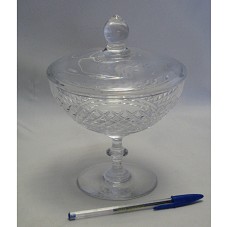 BOMBONIERE (15X15X19 CM - MEDIDAS COM TAMPA) CONFECCIONADA EM CRISTAL. POSSUI BOJO TRABALHADO COM TEXTURA DE CASCA DE ABACAXI. NA TAMPA, A COROA E AS INICIAIS REAIS GRAVADAS. POSSUI NOME DO FABRICANTE GRAVADO NA BASE. ACONDICIONADA EM ESTOJO FORRADO DE NAPA AZUL MARINHO, COM MESMAS INICIAIS NA TAMPA.