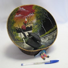 ARTESANATO (19X22X14 CM) CONFECCIONADO EM CASCA DE CABAÇA. POSSUI PINTURA NA PARTE INTERNA, RETRATANDO PAISAGEM DO PÔR-DO-SOL, EM UM RIO, COM VEGETAÇÕES AO REDOR. POSSUI ESCULTURA CONFECCIONADA EM MADEIRA, MOSTRANDO UM TRONCO DE ÁRVORE ONDE HÁ UMA ARARA VERMELHA, NO GALHO; E UM JABUTI NA BASE. NA PARTE INFERIOR DA BASE, A INSCRIÇÃO 'LEMBRANÇA DE COARI-AM / BUFFET ART'NATIVA / FONE 097 9111-2628 / SELMA RODRIGUES'.