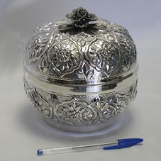 BOMBONEIRA (15X16,5X16,5 CM) CONFECCIONADA EM PRATA 925, DE BASE CIRCULAR, TRABALHADA COM MOTIVOS FLORAIS, EM ALTO RELEVO. NA TAMPA, PEGADOR EM FORMA DE FLORES. ACOMPANHA CARTÃO DO AGENTE. NO FUNDO DA BASE, A INSCRIÇÃO GRAVADA 'KARIYER 925'. ACONDICIONADA EM ESTOJO FORRADO DE VELUDO AZUL MARINHO.