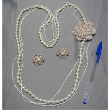CONJUNTO DE COLAR E BRINCOS. COLAR COMPRIDO, EM CONTAS DE PÉROLAS FALSAS, COMPOSTO POR TRÊS CORDÕES: UM COM PÉROLAS GRANDES; DOIS COM PÉROLAS PEQUENAS UNIDAS POR FIO TRABALHADO EM CROCHÊ. POSSUI UM BROCHE, NO FORMATO DE UMA FLOR, EM TOM CHAMPANHE, CONFECCIONADO EM RENDA IRLANDESA. ACOMPANHA UM PAR DE BRINCOS, CONFECCIONADO NO MESMO MATERIAL DO BROCHE. ACONDICIONADO EM SACO PLÁSTICO.