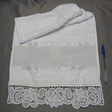 TOALHA DE ROSTO (33X50 CM) NA COR BRANCA. POSSUI FAIXA PARA BORDADO COM APLIQUE DA LETRA 'M' E UMA FLOR, CONFECCIONADO EM RENDA IRLANDESA; E BARRA TRABALHADA NA MESMA RENDA, COM MOTIVOS FLORAIS. POSSUI ETIQUETA 'RENDA IRLANDESA / PATRIMÔNIO CULTURAL DO BRASIL', COM NOME E ORIGEM DA BORDADEIRA, BEM COMO TELEFONE. ACONDICIONADO EM SACO PLÁSTICO.