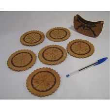 CONJUNTO DE SEIS PORTA-COPOS (9 CM) EM COURO COM DESENHOS CIRCULARES NO CENTRO. ACONDICIONADOS EM UMA ESPÉCIE DE FRASQUEIRA TAMBÉM EM COURO COM AS INSCRIÇÕES NAS LATERAIS 'MARISA LETÍCIA LULA' E 'PARAGUAY'.