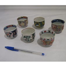 CONJUNTO PARA SAQUÊ COMPOSTO POR SEIS XÍCARAS . EM CADA PEÇA, PINTURAS DIFERENTES FEITAS A MÃO, DE MOTIVOS FLORAIS. NO FUNDO DE CADA PEÇA, IDEOGRAMA CHINÊS. ACONDICIONADO EM CAIXA DE PAPELÃO NA COR VERDE.