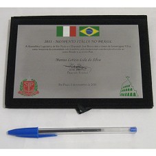 PLACA (10X15 CM) EM METAL PRATEADO. POSSUI A INSCRIÇÃO '2011 - MOMENTO ITÁLIA NO BRASIL / A ASSEMBLÉIA LEGISLATIVA DE SÃO PAULO E O DEPUTADO JOSÉ BRUNO TÊM A HONRA DE HOMENAGEAR V.EXA., COMO INTEGRANTE DA COMUNIDADE ÍTALO-BRASILEIRA, PELA FUNDAMENTAL CONTRIBUIÇÃO OFERECIDA AO NOSSO ESTADO E AO NOSSO PAÍS. MARISA LETÍCIA LULA DA SILVA / JOSÉ BRUNO / DEPUTADO ESTADUAL / SÃO PAULO, 8 DE NOVEMBRO DE 2010'. FIXADA EM BASE DE VELUDO PRETO. ACOMPANHA CARTÃO DE VISITA EM NOME DO CHEFE DE GABINETE DO DEPUTADO, 'FRAN DE OLIVEIRA'. ACONDICIONADA EM ENVELOPE BRANCO.