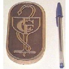 PLACA EM METAL DOURADO (13,5X6,5X1 CM), TENDO NAS DUAS FACES O SÍMBOLO DO 'CONSELHO FEDERAL DE FARMÁCIA', E A INSCRIÇÃO 'CFF'. NAS LATERAIS, GRAVADO, 'CONSELHO FEDERAL DE FARMÁCIA' E 'BRASIL'. ACONDICIONADA EM CAIXA (14,5X18,5X3 CM) FORRADA EXTERNAMENTE EM LYCRA VERMELHA.