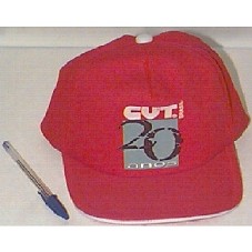 BONÉ, EM TECIDO VERMELHO E DETALHES EM BRANCO. NA FRENTE, ESTAMPA COM LOGOMARCA DA 'CUT 20 ANOS / BRASIL', EM BRANCO/CINZA/PRETO.