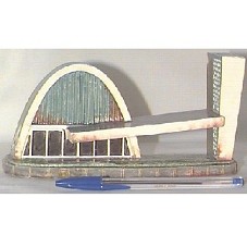 MAQUETE (20X6X10 CM) DA FACHADA DA IGREJA DE SÃO FRANCISCO DE ASSIS (MG), CONFECCIONADA EM GESSO, PINTADA NAS CORES AZUL, CINZA, BRANCO, PRETO, VERDE E MARROM. NA PARTE POSTERIOR, PAPEL COLADO COM INFORMAÇÃO SOBRE A OBRA. ACONDICIONADO EM CAIXA DE PAPELÃO (26X11X11,5 CM), COM A INSCRIÇÃO 'PROGRESSO HUDTELFA'.