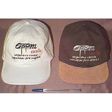 DOIS BONÉS, UM NA COR BRANCA, OUTRO NAS CORES VERDE E OCRE. AMBOS COM MESMO BORDADO: NA FRENTE, 'OPPM ESCOLA / ORQUESTRA ESCOLA PETROBRAS PRÓ MÚSICA'; E, ATRÁS, SÍMBOLO DA BANDEIRA 'BR' DA PETROBRÁS.