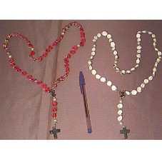 DOIS TERÇOS CONFECCIONADOS COM ROSAS DE FITA DE CETIM, COM A CRUZ EM PEDRA MINERAL NA COR VERDE. UM DOS TERÇOS, COM ROSAS BRANCAS E FITA VERDE; MEDALHA TENDO EM UM DOS LADOS A FACE DA VIRGEM MARIA, E, DO OUTRO, JESUS CRISTO; ACONDICIONADO EM CAIXA DE PAPELÃO BRANCO (10X6,5X3,5 CM), TENDO NA TAMPA FOTO DE NOSSA SENHORA APARECIDA. O OUTRO, COM ROSAS VERMELHAS E FITA VERDE; MESMA MEDALHA; ACONDICIONADO EM CAIXA DE PAPELÃO BRANCO (10X6,5X3,5 CM), TENDO NA TAMPA FOTO DA VIRGEM DESATADORA DE NÓS.
