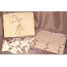 CONJUNTO DE: SEIS GUARDANAPOS (38X39 CM) EM ALGODÃO CRU, NA COR CREME, COM BICO DE CROCHÊ EM TODA SUA EXTREMIDADE, PRESOS A UM ANEL DE PALHA BORDADO COM MOTIVOS RUPESTRES, NA COR VINHO; SEIS JOGOS AMERICANOS (30,5X40,5 CM) EM PALHA, COM MESMOS MOTIVOS BORDADOS. ACONDICIONADOS EM CAIXA DE PALHA (33X42,5X5,5 CM), BORDADA NA TAMPA, EM VINHO, MESMO MOTIVO. ACOMPANHA INFORMATIVO SOBRE A PEÇA, 'LAJEDO DE SOLEDADE / PURA ARTE / APODI-RN-BRASIL'.