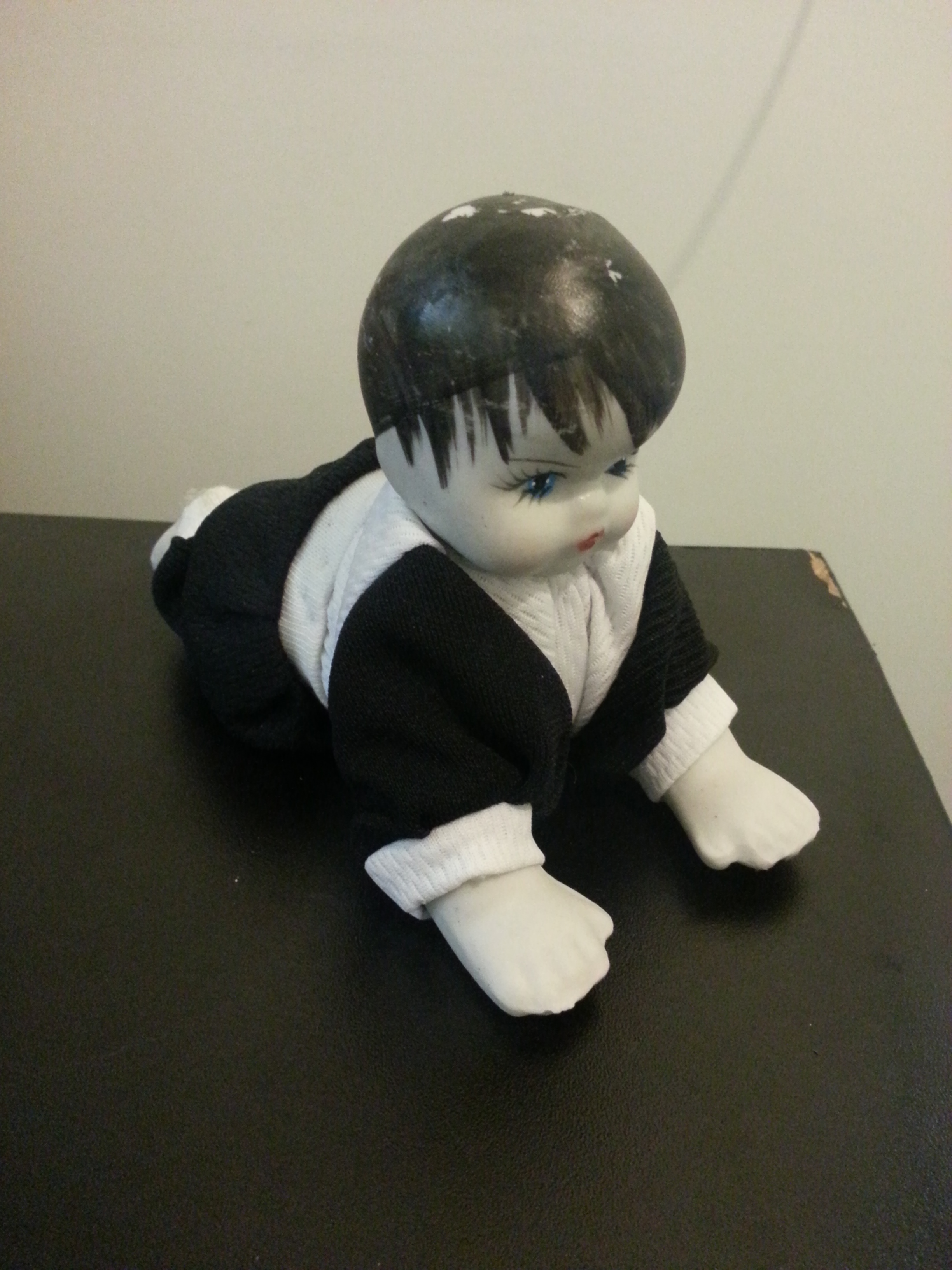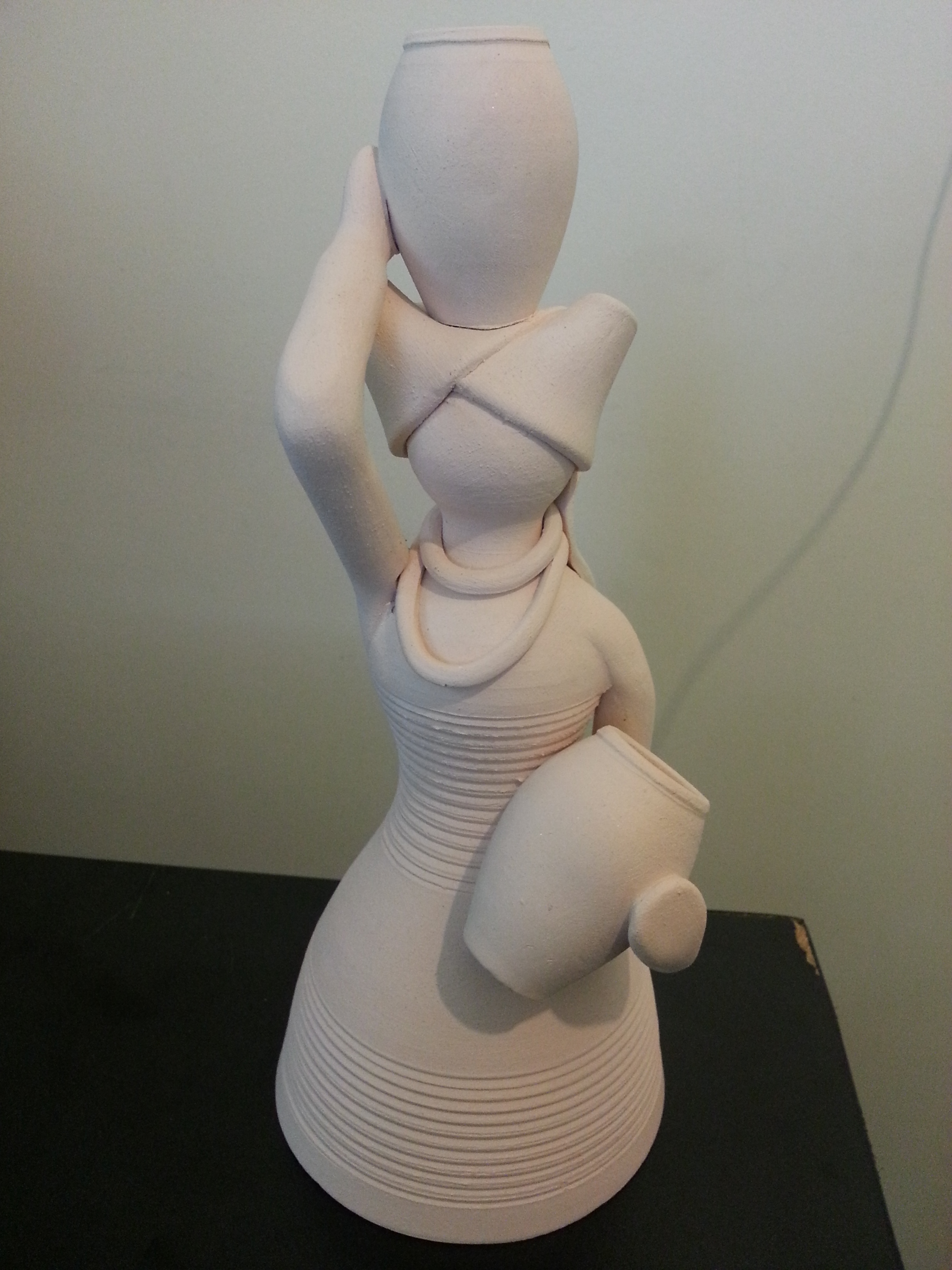 Estátua de barro branca de mulher segurando um jarro de água nas mãos e um outro na cabeça, lembrança recebida do Programa do Artesanato de Pernambuco (Local desconhecido, 2012).