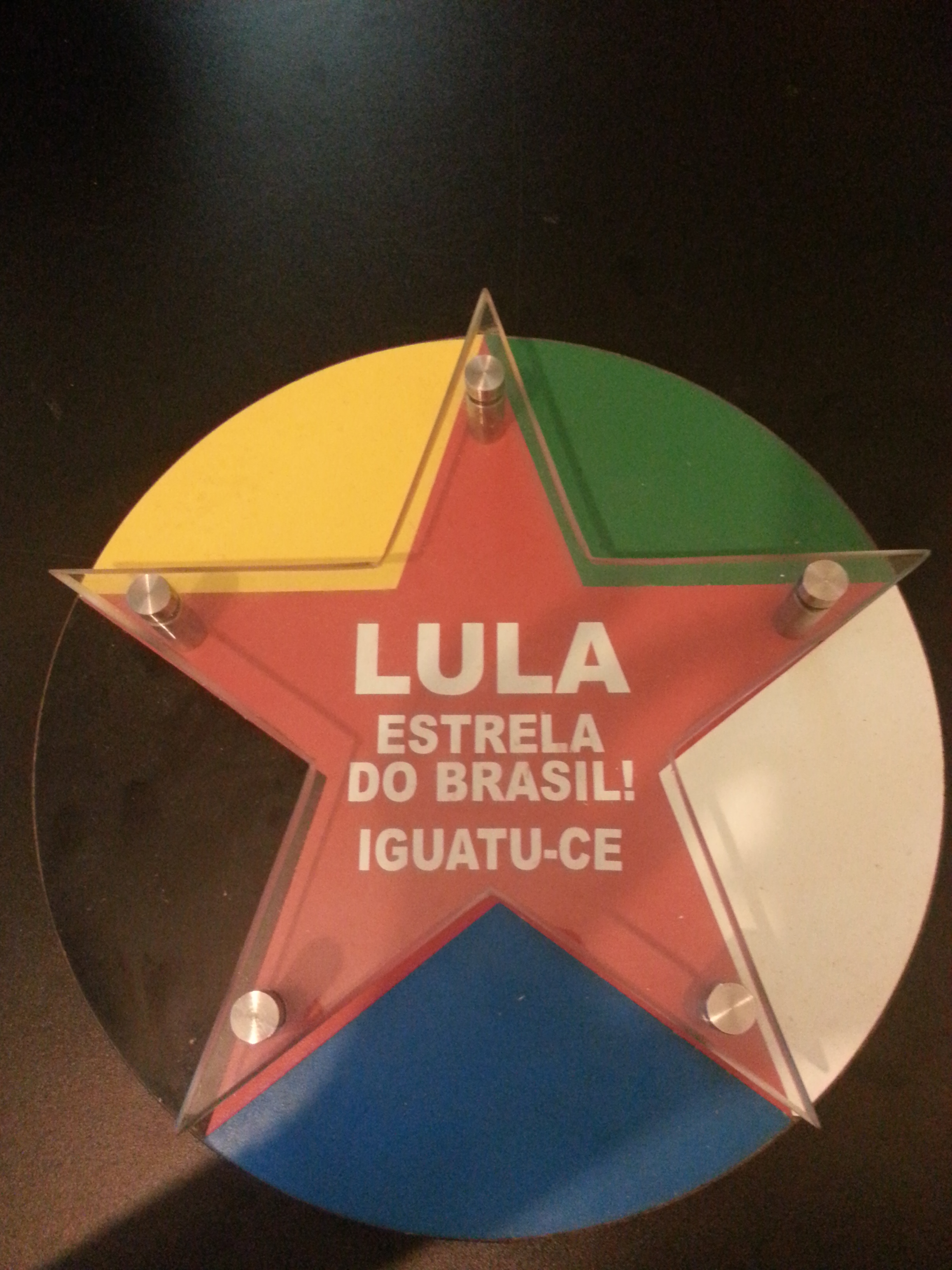 Estrela de vidro fixada em madeira colorida com escrita "Lula, estrela do Brasil! Iguatu-CE". (Local desconhecido, 10 out. 2011)