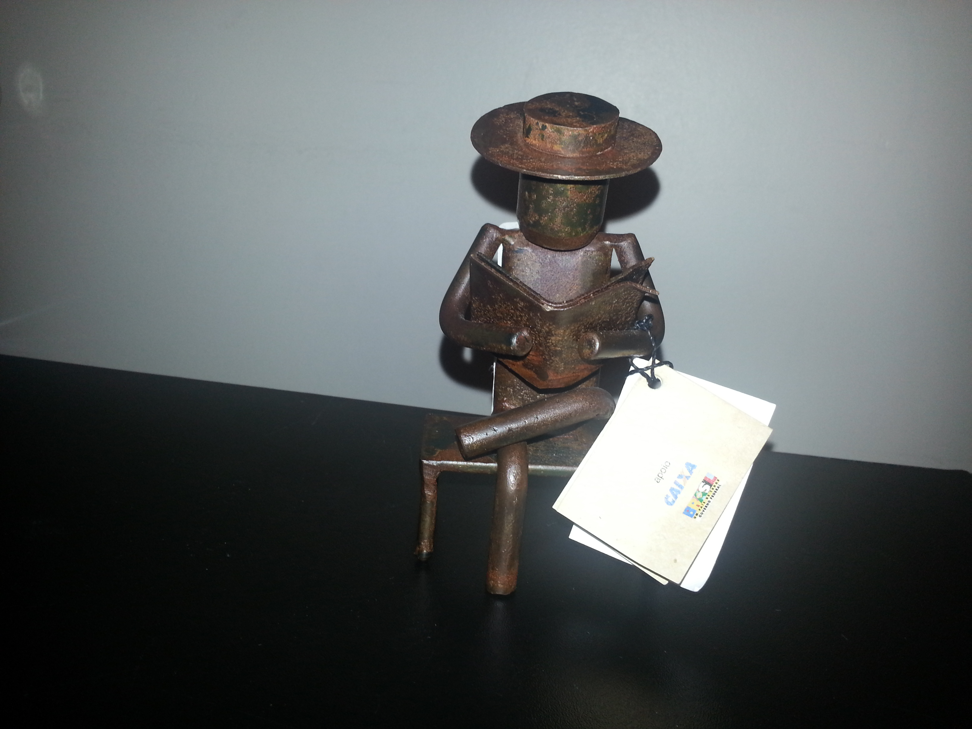Boneco de ferro de homem lendo, lembrança da Formatura da 1ª Turma do IFNMG, Campus Araçuaí, pelo presidente Lula ter sido paraninfo de turma de 210 alunos (Vale de Jequitinhonha-MG, [19 ago. 2011]).
