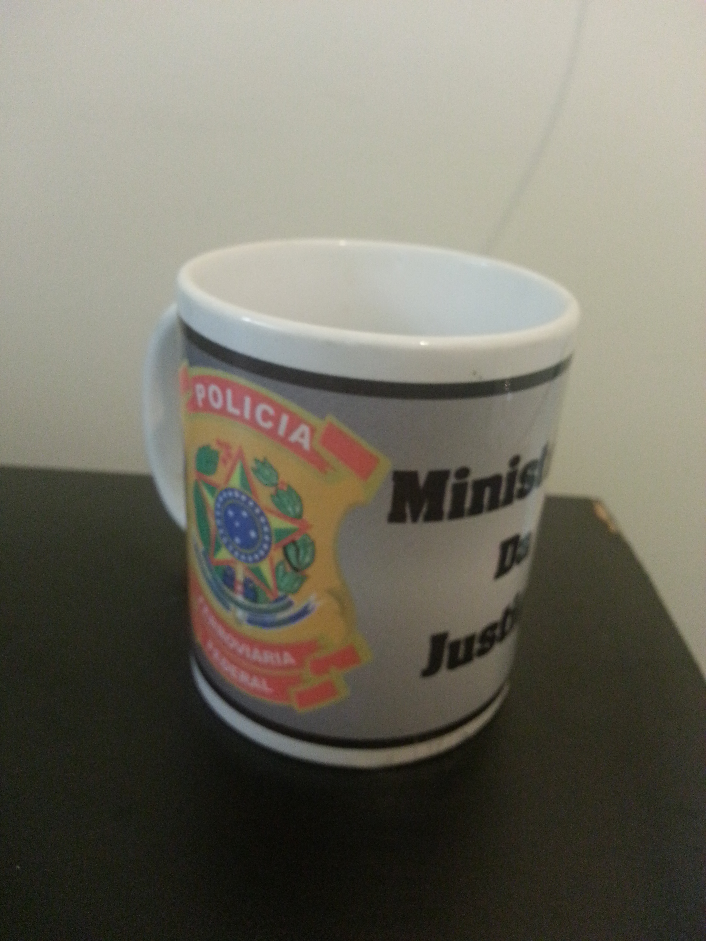 Caneca de porcelana, com logomarca do Ministério da Justiça, recebida em visita da Polícia Ferroviária Federal ao Instituto Lula ([São Paulo-SP], 21 jul. 2011).