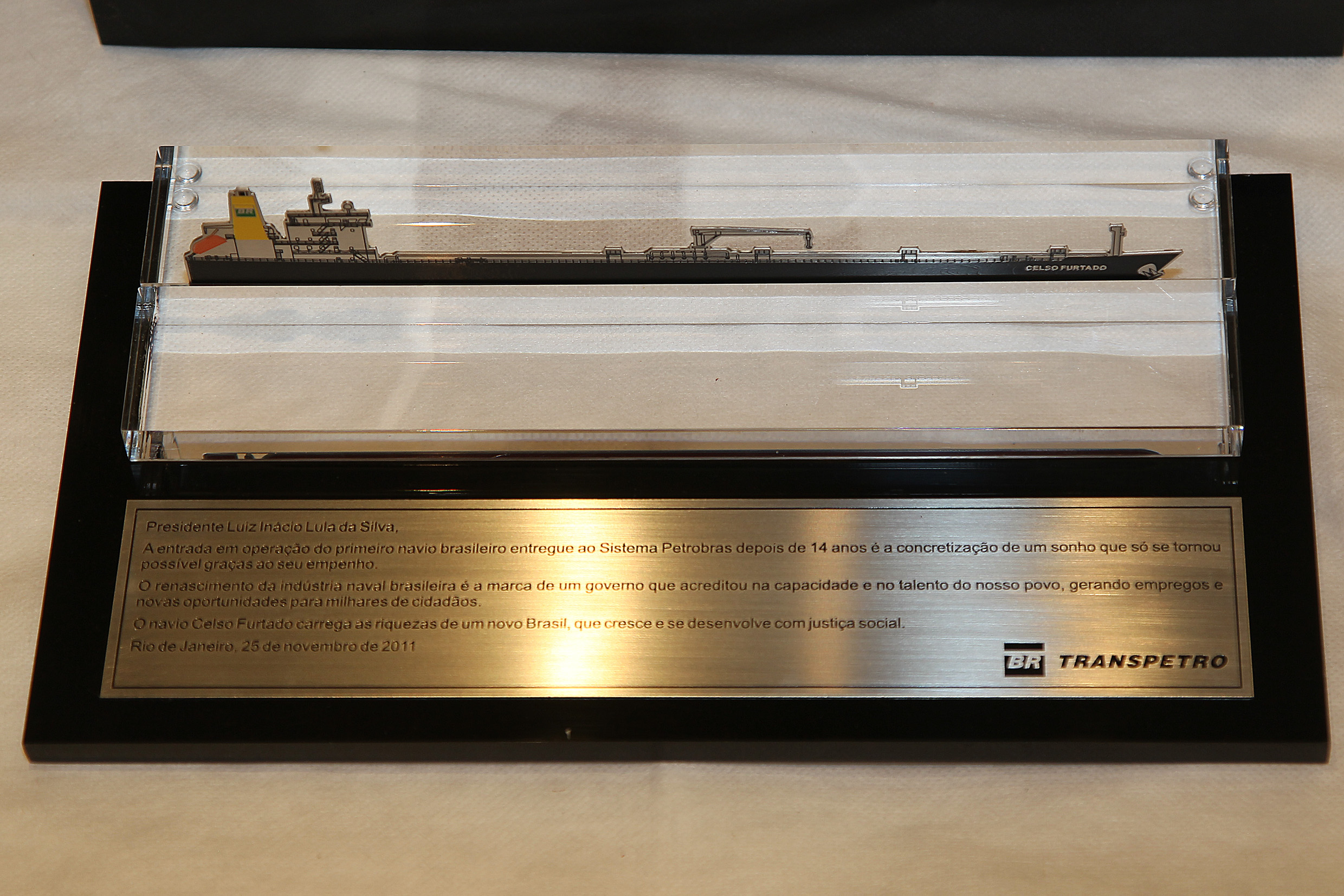 Navio do Programa de Modernização e Expansão da Frota da Transpetro, produto Celso Furtado, recebido no Estaleiro Mauá, do sr. Sérgio Machado da Petrobrás, símbolo de vitória de um governo que acreditou na capacidade e no talento do povo brasileiro (Niterói-RJ, 25 nov. 2011).