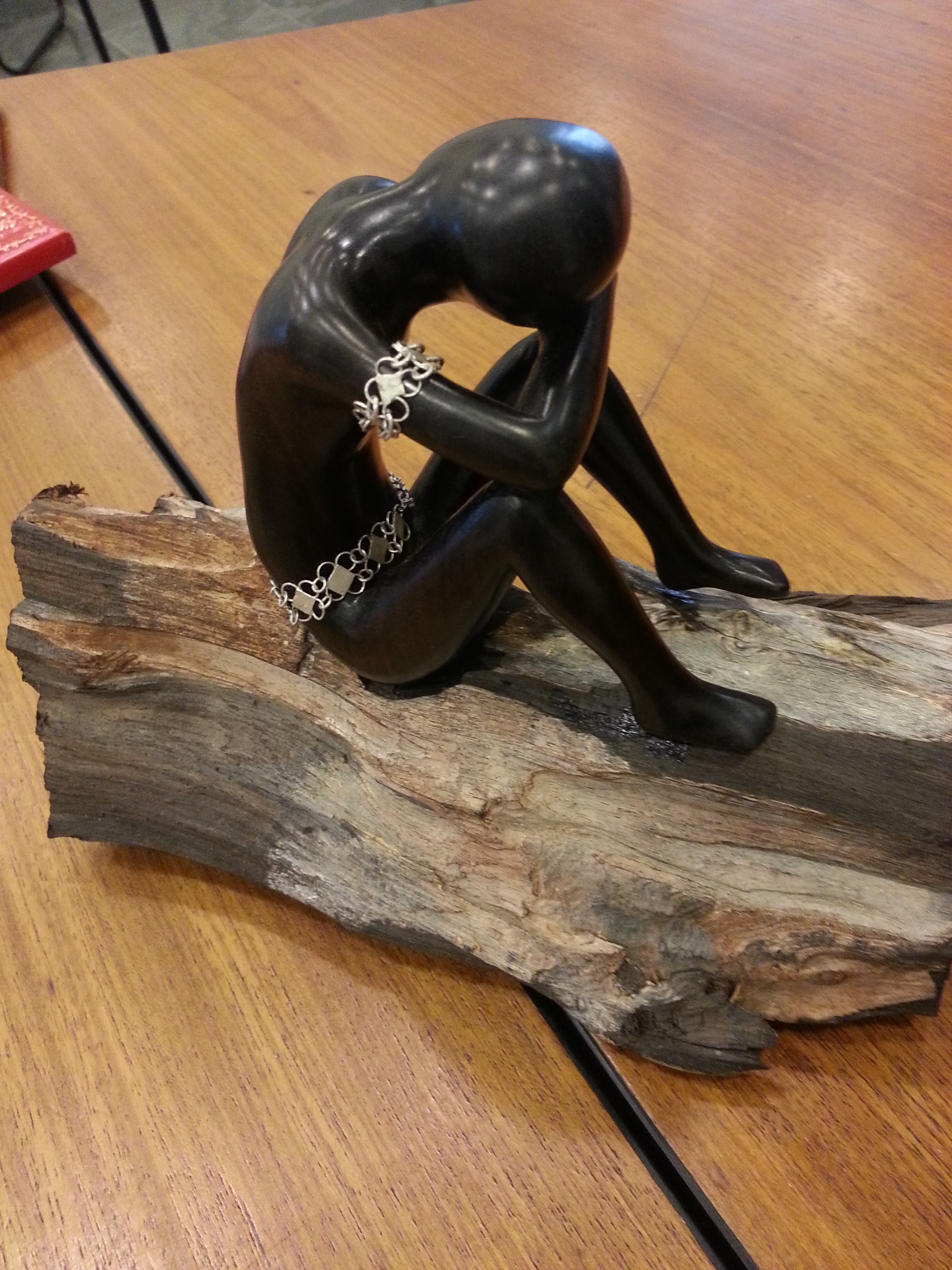 Estátua preta, de mármore africano, de uma negra sentada de frente com os braços sobre as pernas (Moçambique-MZ, 19 a 20 nov. 2012).