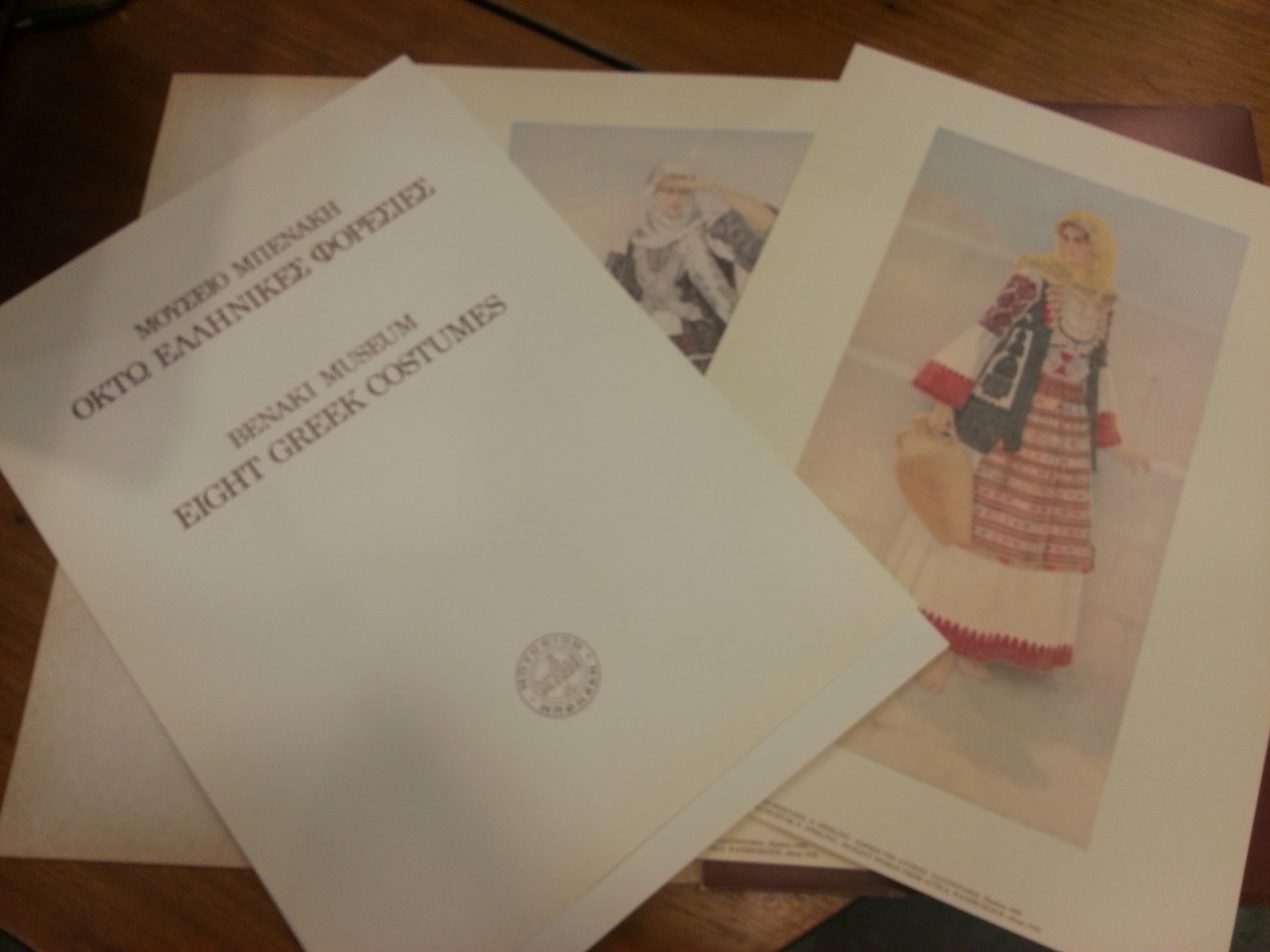 Encarte do Museu Benaki contendo imagens de vestimentas que representam Cultura Grega, prodzido uem capa de papelão vermelho escuro, escrita branca, recebido do senhor Alexis Tsipras, líder do partido de esquerda grego Suriza Tsipas (Local desconhecido, 18 dez. 2012).