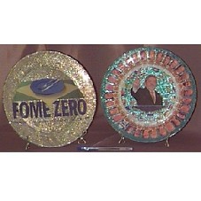 DOIS PRATOS DECORATIVOS (26 CM), CONFECCIONADOS COM PRATO COMUM DE VIDRO TRANSPARENTE, RECORTES DE REVISTAS, PAPEL CELOFANE E DE SEDA, ARAME. ACOMPANHAM SUPORTES DE MESA EM ARAME, ALÉM DE GANCHOS PARA FIXAR EM PAREDE. NO PRIMEIRO, FUNDO AZUL, FOTO DO PRESIDENTE LUIZ INÁCIO LULA DA SILVA AO CENTRO, COM A INSCRIÇÃO 'A ESPERANÇA VENCEU O MEDO'. AO REDOR DELE, FOTOS COM RESPECTIVOS NOMES E PROFISSÕES DOS PRESIDENTES ANTERIORES E, BANDEIRAS DOS ESTADOS BRASILEIROS. ATRÁS, UMA COROA E A INSCRIÇÃO 'AO COMPANHEIRO LULA, EXEMPLO DE GARRA E DETERMINAÇÃO PARA O BRASIL E PARA O MUNDO / RESPEITOSA HOMENAGEM DO AMIGO: RIBEIRO / ANTÔNIO LUIZ RIBEIRO / EVINHA E SAMIRA / 0XX3138471477 / R. PORTUGAL, 372 - 35182260 TIMÓTEO-MG'. NO SEGUNDO, FUNDO AMARELO, E SÍMBOLO DO PROGRAMA FOME ZERO, COM RESPECTIVA INSCRIÇÃO.