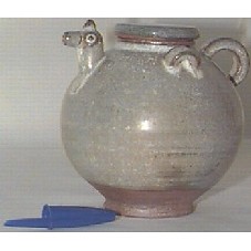 POTE (9,5X8X8 CM), EM CERÂMICA, EM FORMA DE 'GALO CELESTE'. MODELO ORIGINÁRIO DA GRÉCIA ANTIGA, CHEGANDO AO JAPÃO ATRAVÉS DE GANDARA E CHINA. RECONSTITUÍDO PELO ARTISTA YUSUKE MATSUSHITA. POTE COM ALÇA, TAMPA E FURO NA BOCA DO GALO. ACOMPANHA FOLHETO COM INSCRIÇÕES EM JAPONÊS. ACONDICIONADO EM CAIXA DE MADEIRA (11X11X15 CM) COM IDEOGRAMAS JAPONESES NA TAMPA.