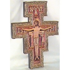 CRUZ DE SÃO FRANCISCO (17X12,5 CM) EM MADEIRA POLICROMADA, TENDO NA FRENTE IMAGEM DE CRISTO NA CRUZ, COM FIGURAS DE ALGUMAS PESSOAS EM VOLTA DELA. BORDA FRONTAL DA CRUZ ARREMATADA EM METAL DOURADO. ATRÁS, A INSCRIÇÃO ''FRANCISCO, VAI E REPARA A MINHA CASA QUE , COMO VÊS, ESTÁ TODA DESTRUÍDA.' / A EXEMPLO DE SÃO FRANCISCO QUE RECEBEU DE CRISTO O MANDATO DE RECONSTRUIR A SUA IGREJA, NÓS OS FRANCISCANOS CONVENTUAIS DESEJAMOS AO PRESIDENTE LULA AS GRAÇAS E AS FORÇAS NECESSÁRIAS PARA RECONSTRUIR O BRASIL 04/09/2003'. ACONDICIONADO EM SACO PRETO, ESTE EM CAIXA DE PAPELÃO CINZA.