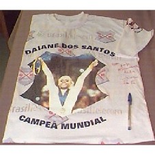 CAMISETA EM MALHA BRANCA, DE MANGA CURTA. NA FRENTE, ESTAMPA COM FOTO DA ATLETA DAIANE DOS SANTOS, E INSCRIÇÃO 'DAIANE DOS SANTOS / CAMPEÃ MUNDIAL'. ATRÁS E NAS MANGAS, SÍMBOLOS DOS PATROCINADORES: 'BRASILTELECOM' E 'GN UNIÃO 1906'.