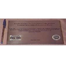 PLACA (15X21 CM) EM METAL PRATEADO ESCOVADO, COM BORDA PRETA GRAVADA E A INSCRIÇÃO: 'EXCELENTÍSSIMO SR. LUIZ INÁCIO LULA DA SILVA / PRESIDENTE DA REPÚBLICA FEDERATIVA DO BRASIL, / A NESTLÉ E OS SEUS CONSUMIDORES TÊM A HONRA DE REALIZAR A ENTREGA DO PRIMEIRO QUILO DE PRODUTOS À PASTORAL DA CRIANÇA COMO PARTE DO SEU COMPROMISSO COM O PROGRAMA FOME ZERO DO GOVERNO FEDERAL. / MAIO DE 2003'. POSSUI DOIS SELOS EMBORRACHADOS, FIXADOS NA PARTE INFERIOR DA PLACA. O PRIMEIRO, COM SÍMBOLO DO PROGRAMA FOME ZERO; E, O SEGUNDO, COM SÍMBOLO DA NESTLÉ. PLACA ACONDICIONADA EM CAIXA (19X25X3 CM) FORRADA DE VELUDO PRETO.