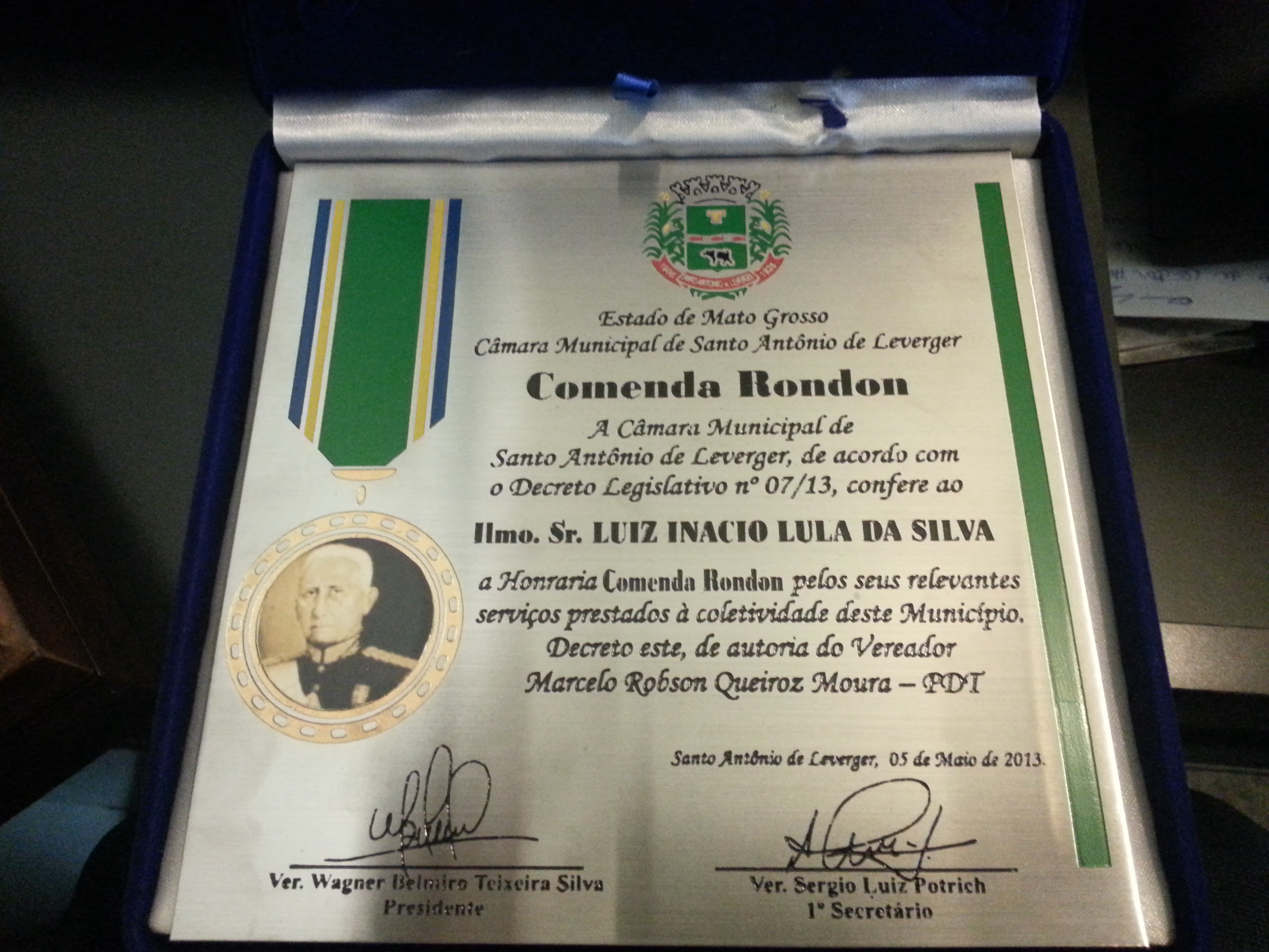 Placa em metal "Honraria Comenda Rondon" do estado de Mato Grosso, da Câmara Municipal de Santo Antônio de Leoerger, datado de 05 de maio de 2013 ([Santo Antônio de Leoerger-MT?], 5 mai. 2013).