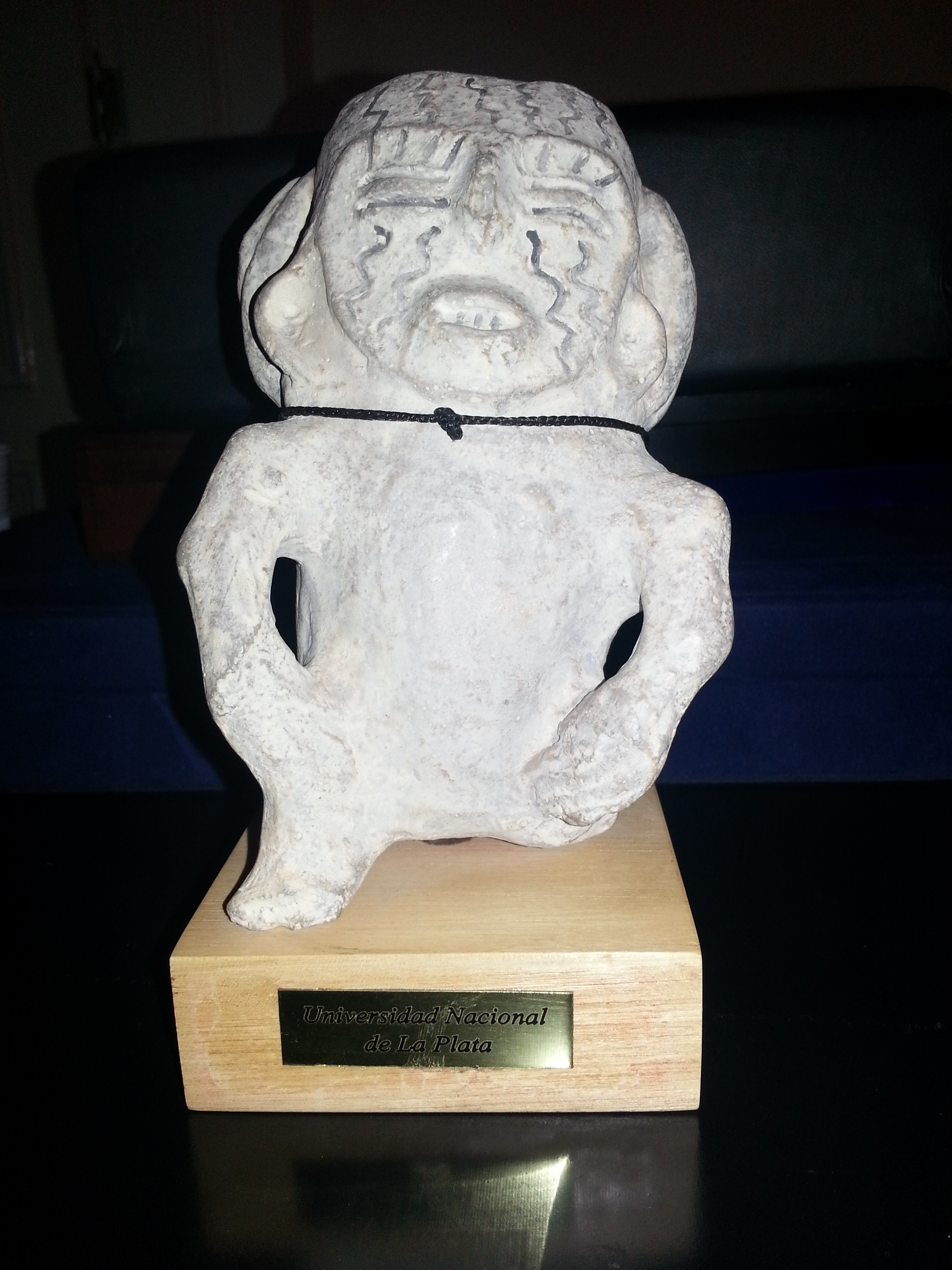 Réplica de uma estátua de barro, simbolizando um homem sobre uma base de madeira onde está escrito: "Universidade Nacional de La Plata (ano 500 a.c. Al 650 d.c.)?, coleção Iafone Quevedo, procedência Catamarca. (Argentina-AR, 17 mai. 2013).