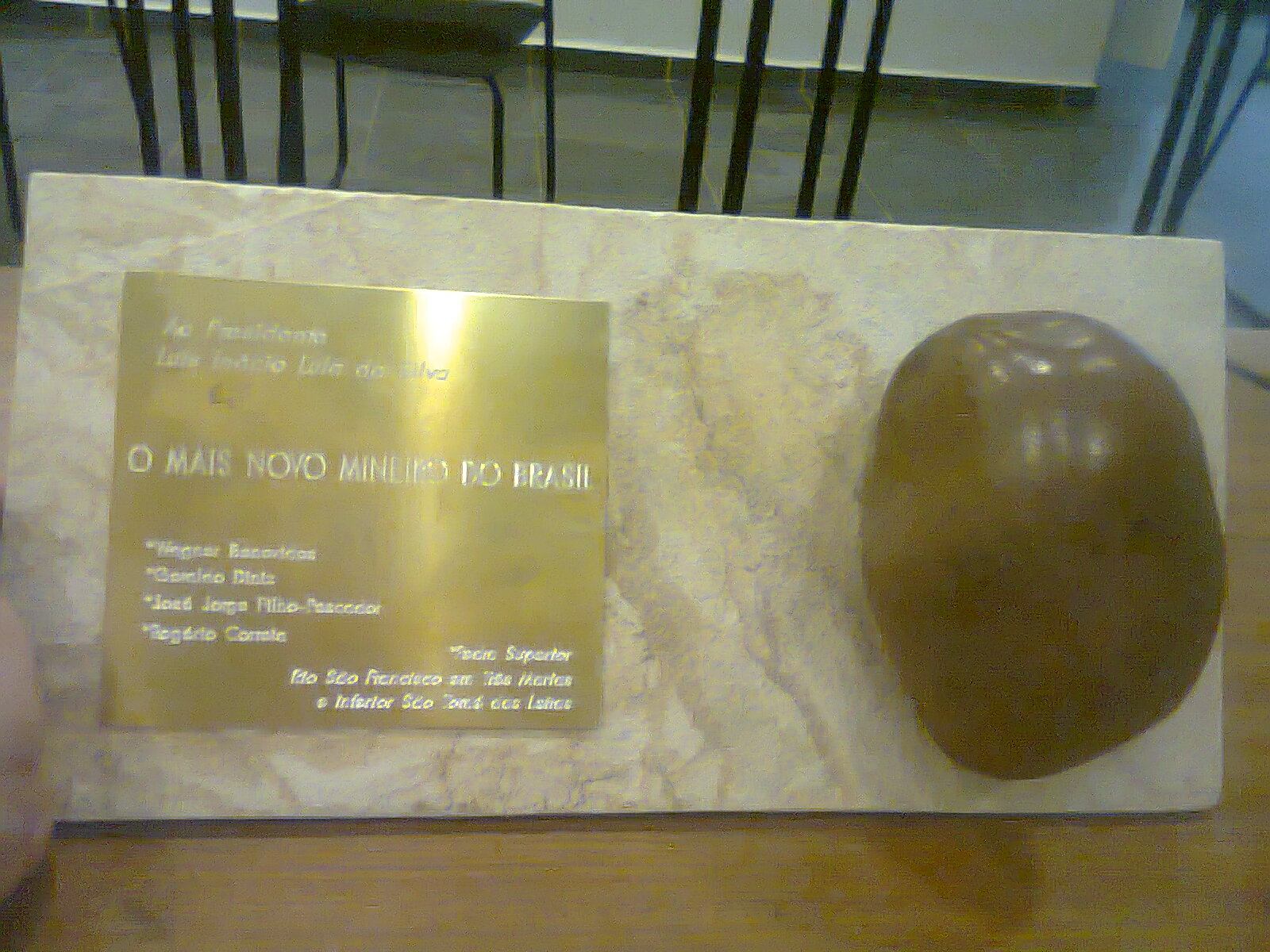 Pedra marrom sobre uma base de mármore com uma placa de metal dourado onde se lê: " ao presidente Luiz Inácio Lula da Silva, o mais novo mineiro do Brasil". (Local desconhecido, 2012).