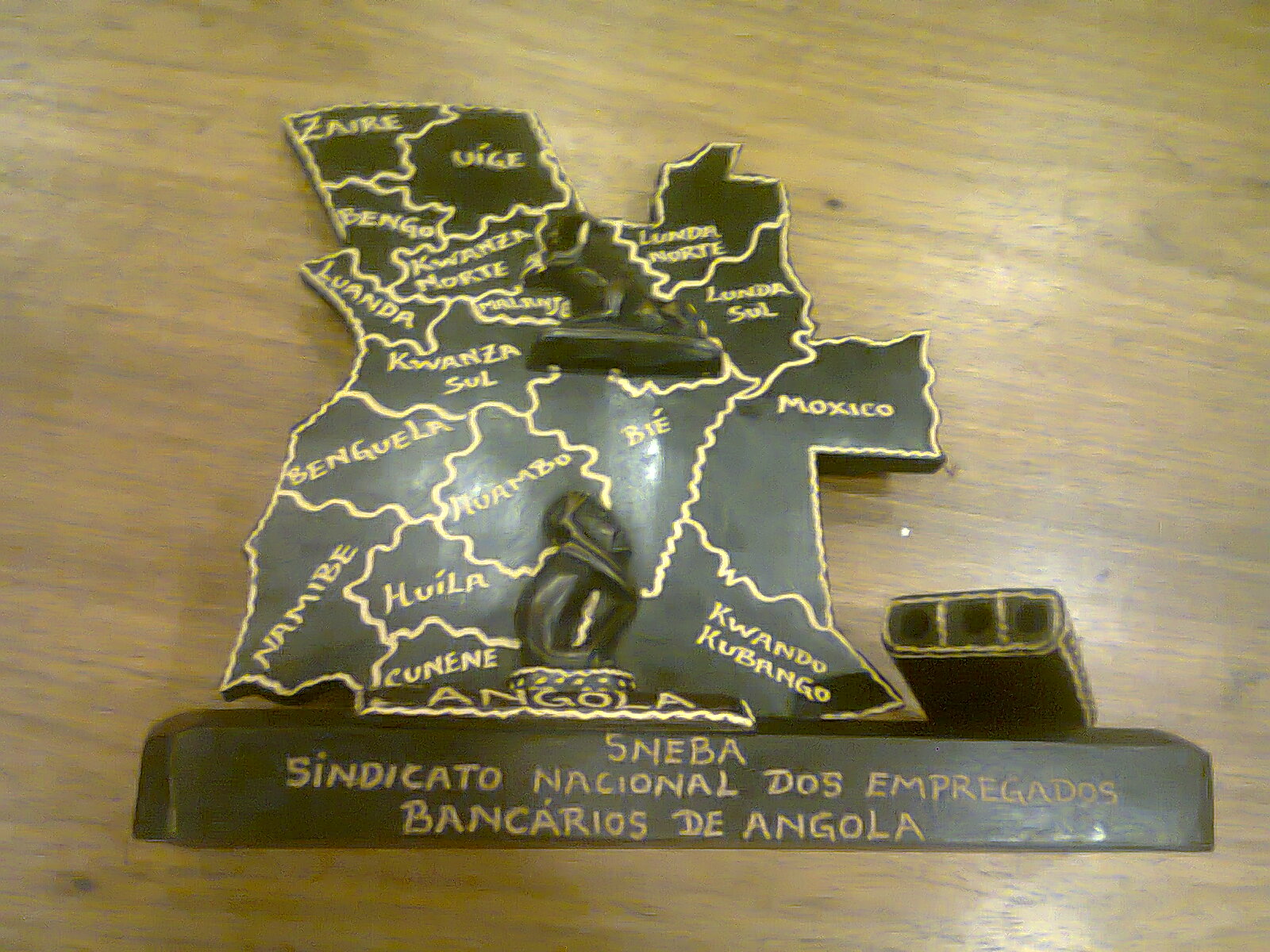 Mapa esculpido em madeira do país Angola sobre base de madeira, no mapa contém um homem agachado com a mão na cabeça e expressão de angústia e um animal semelhante a uma zebu, presente do Sindicato Nacional dos empregadores bancários de Angola, acompanha um porta caneta, recebido na comemoração aos 90 anos do sindicato dos bancários. (Local desconhecido, 16 abr. 2013).
