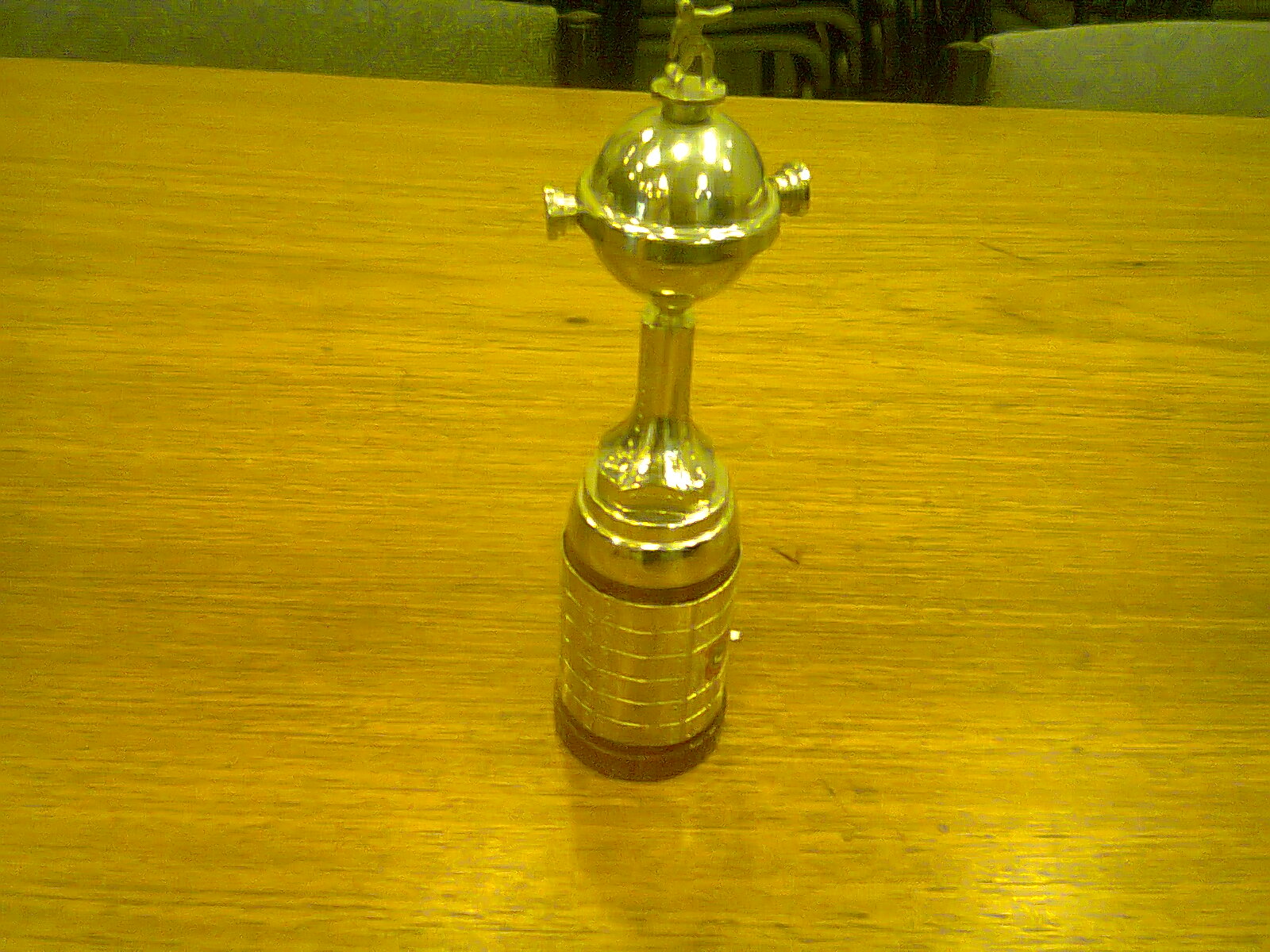 Mini réplica da taça da libertadores dedicada ao Presidente Luiz Inácio Lula da Silva recebido de Flávio Monteiro Moraes, presidente da cooperativa de credito dos bancários, na comemoração de 90 anos do Sindicato Nacional dos bancários. (Local desconhecido, 16 abr. 2013).