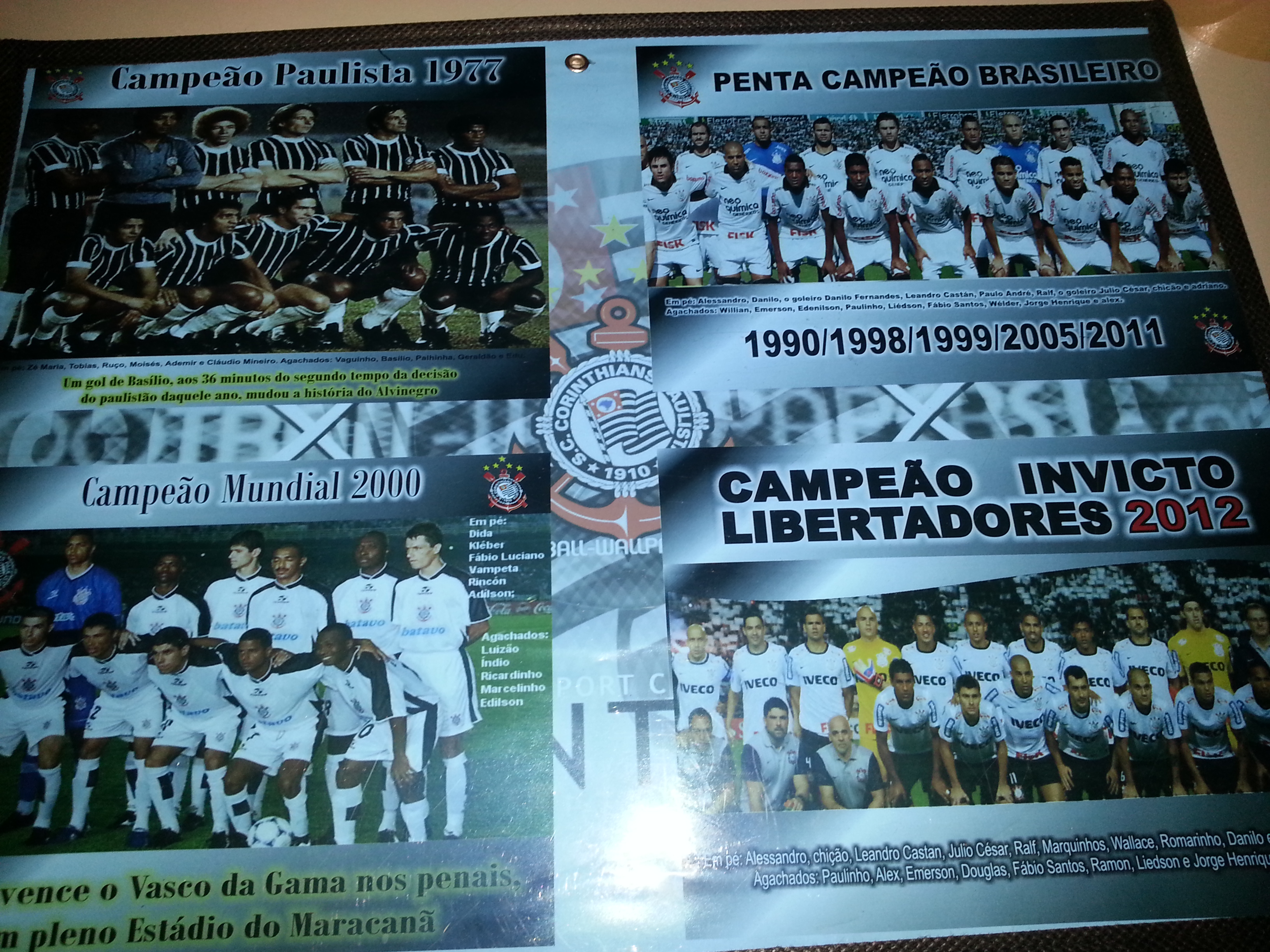 Poster do Corinthians campeão 1977, penta campeão brasileiro, campeão mundial 2000, campeão invicto libertadores 2012. (Local desconhecido, Data desconhecida).
