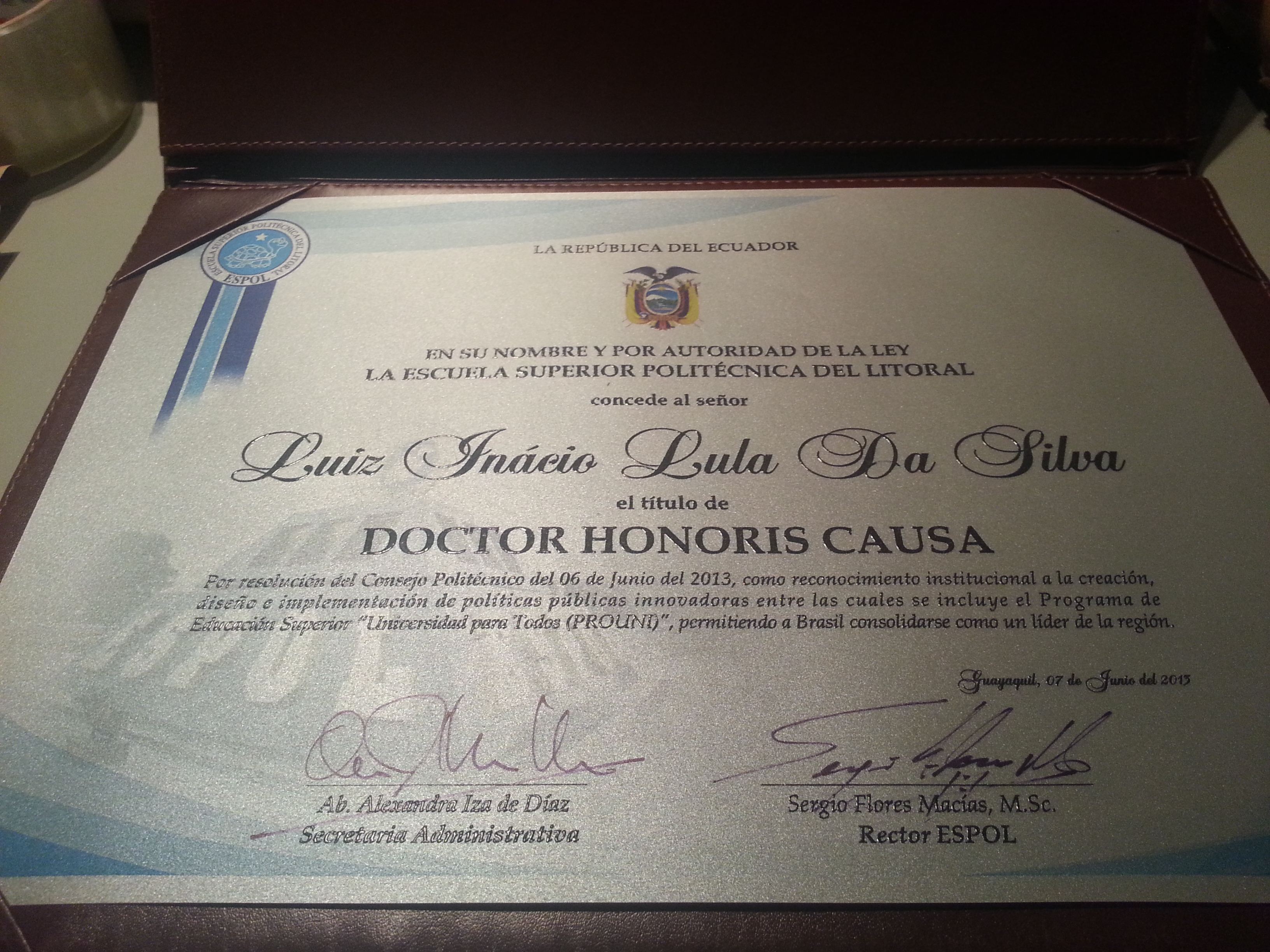 Doutor Honoris Causa el consejo politécnico de la escuela superior politecnica del litoral, espol, dentro de um canudo marrom com o desenho de uma tartaruga e com a escrita: " espol". (Quito-EC, 03 a 08 jun. 2013)