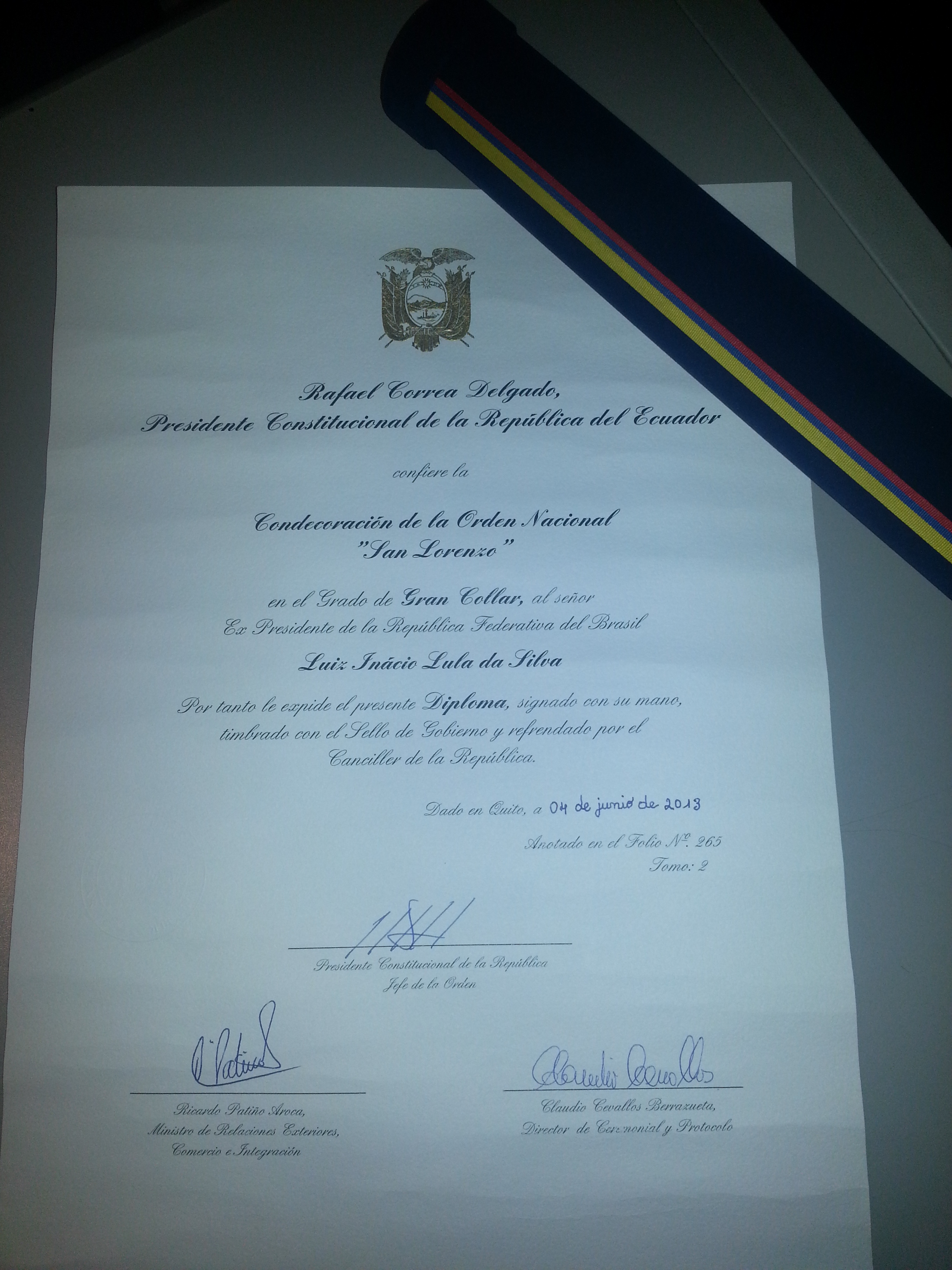 Condecoración de la ordem nacional "San lorenzo", em papel branco com o brasão em dourado, recebida do presidente constitucional de la república del Ecuador, Rafael Correa Delgado. (Quito-EC, 03 a 08 jun. 2013)
