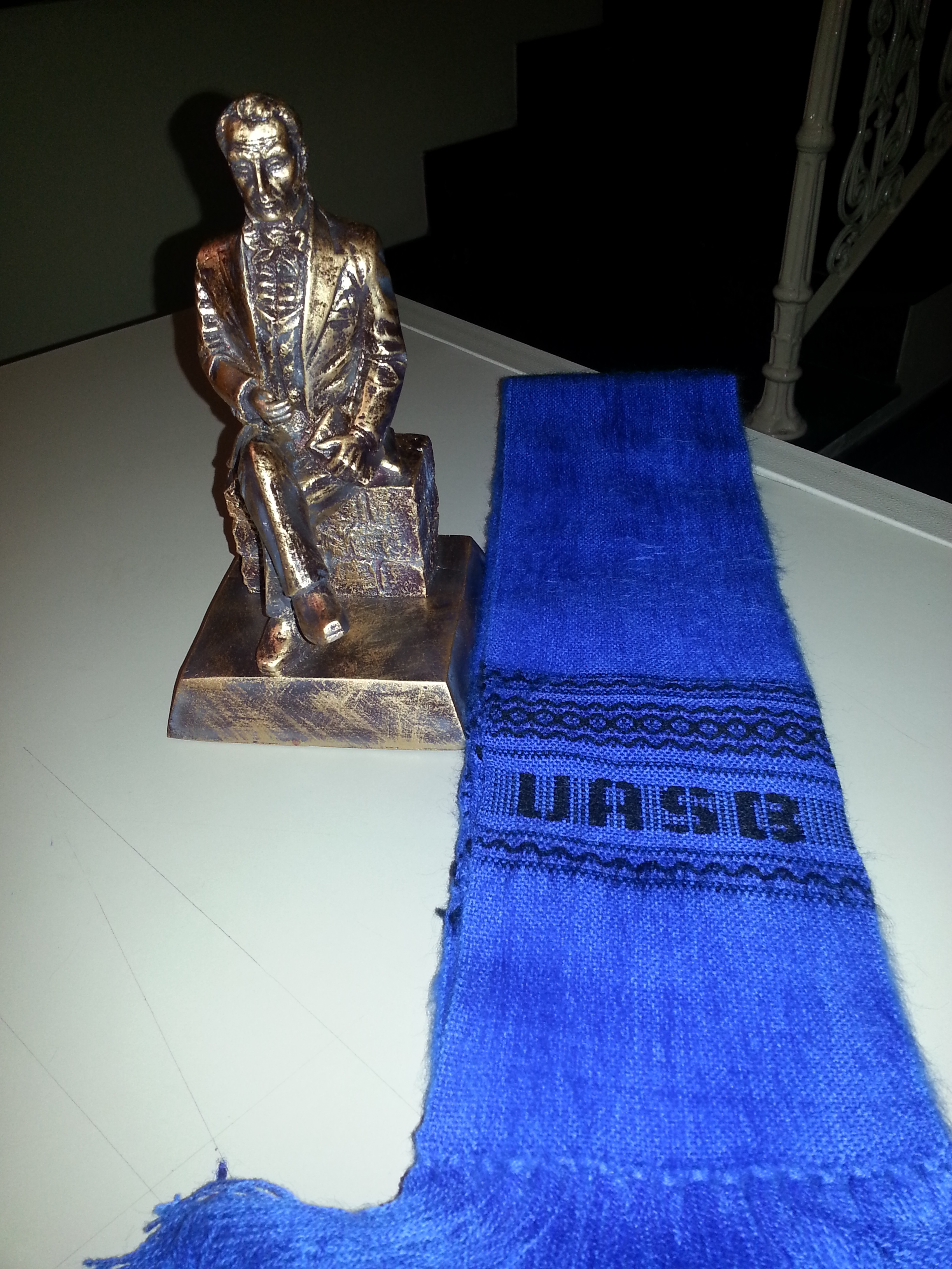 Estátua de um homem sentado, de terno e gravata com um livro na mão feito em madeira, pintado de dourado, junto com um cachecol azul com a sigla uasb bordado em preto, recebida da Universidade Andina Simón Bolivar. (Quito-EC, 03 a 08 jun. 2013)