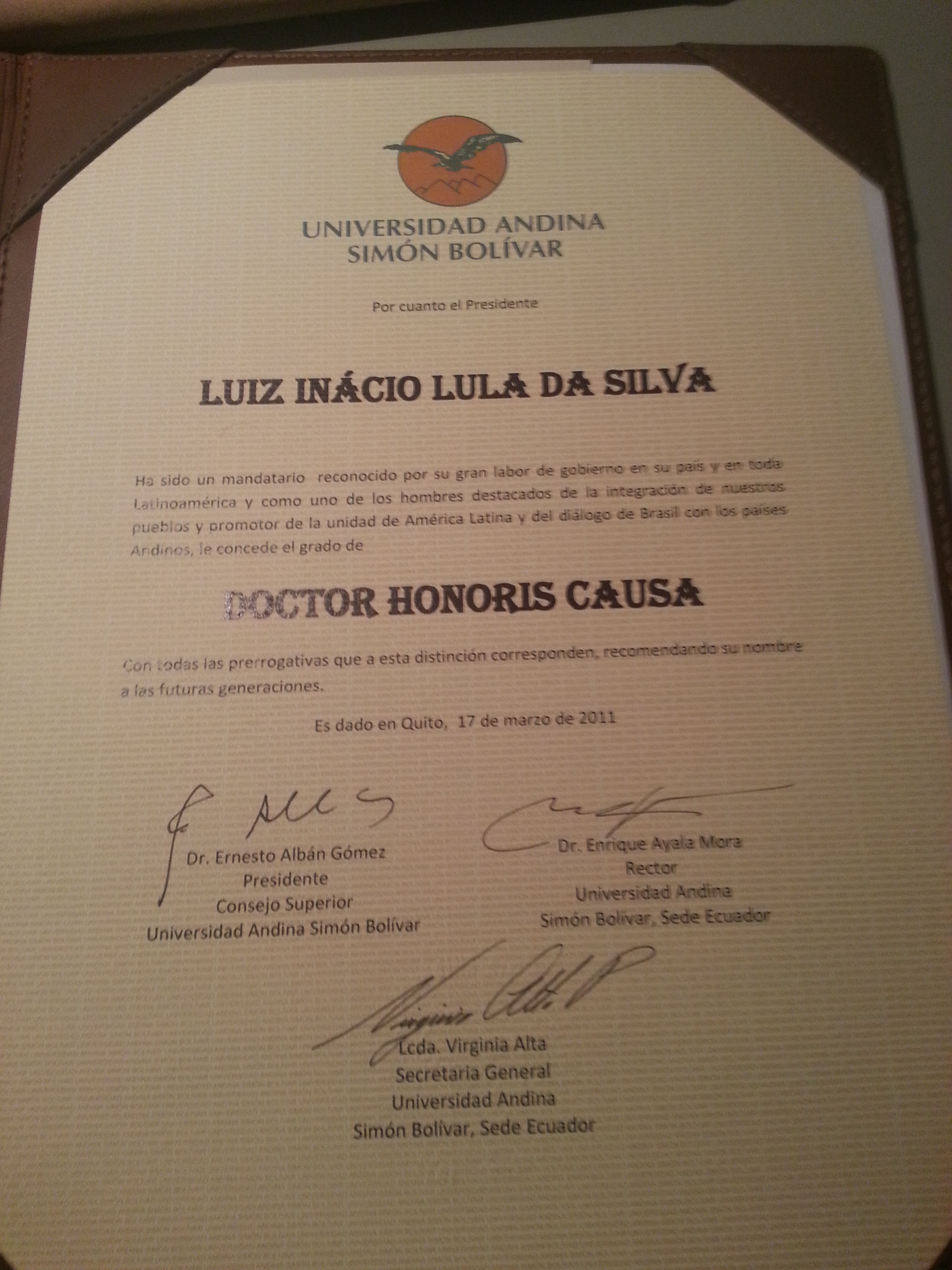 Doutor Honoris Causa, recebido da Universidade Andina Bolívar. (Quito-EC, 03 a 08 jun. 2013)