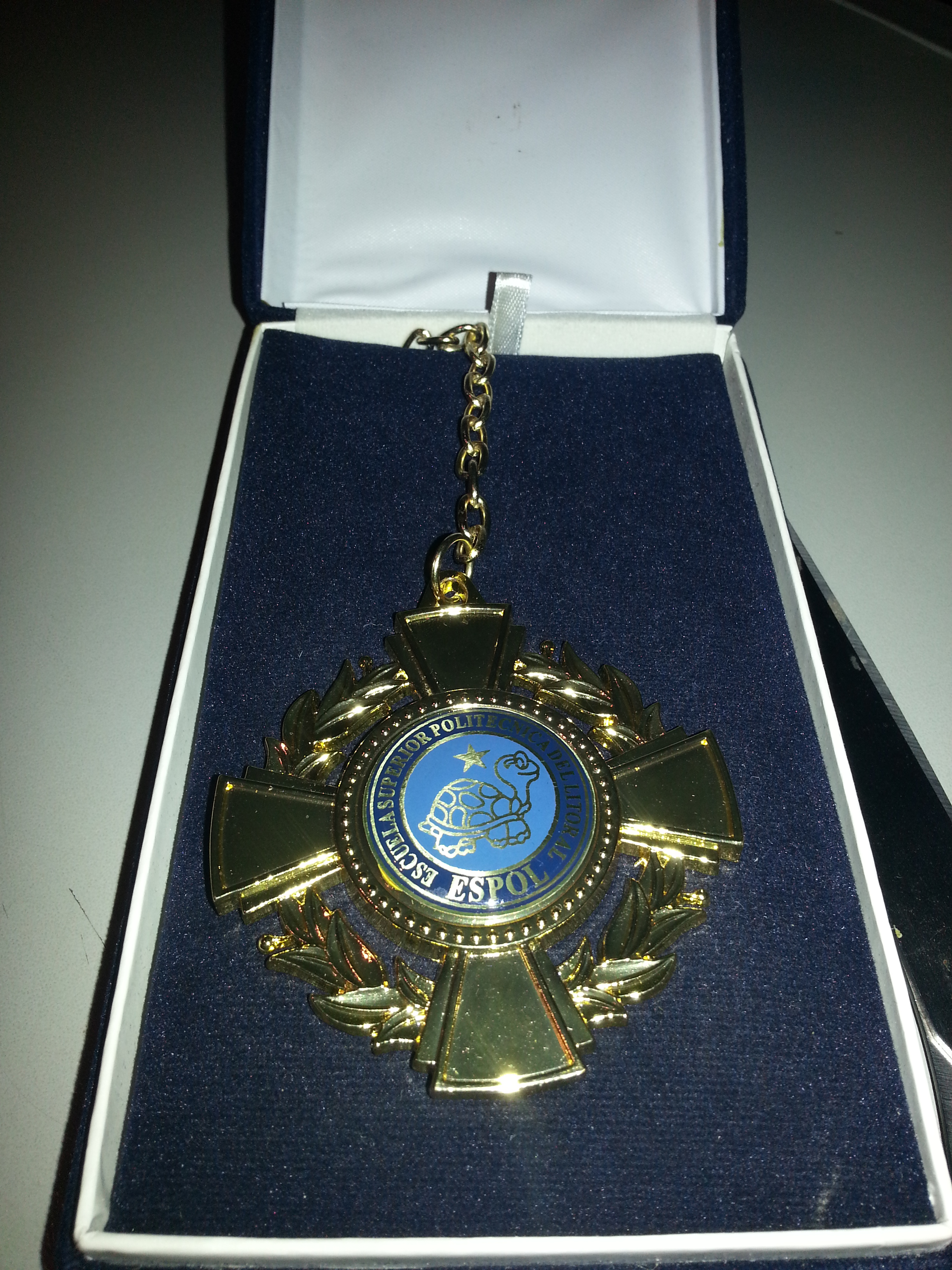 Medalha dourada com alguns ramos de folhas, ao meio detalhe azul claro e azul escuro escrito: escuela superior politécnica del litoral, em dourado e o desenho de uma tartaruga com uma estrela, recebida da espol. (Quito-EC, 03 a 08 jun. 2013).