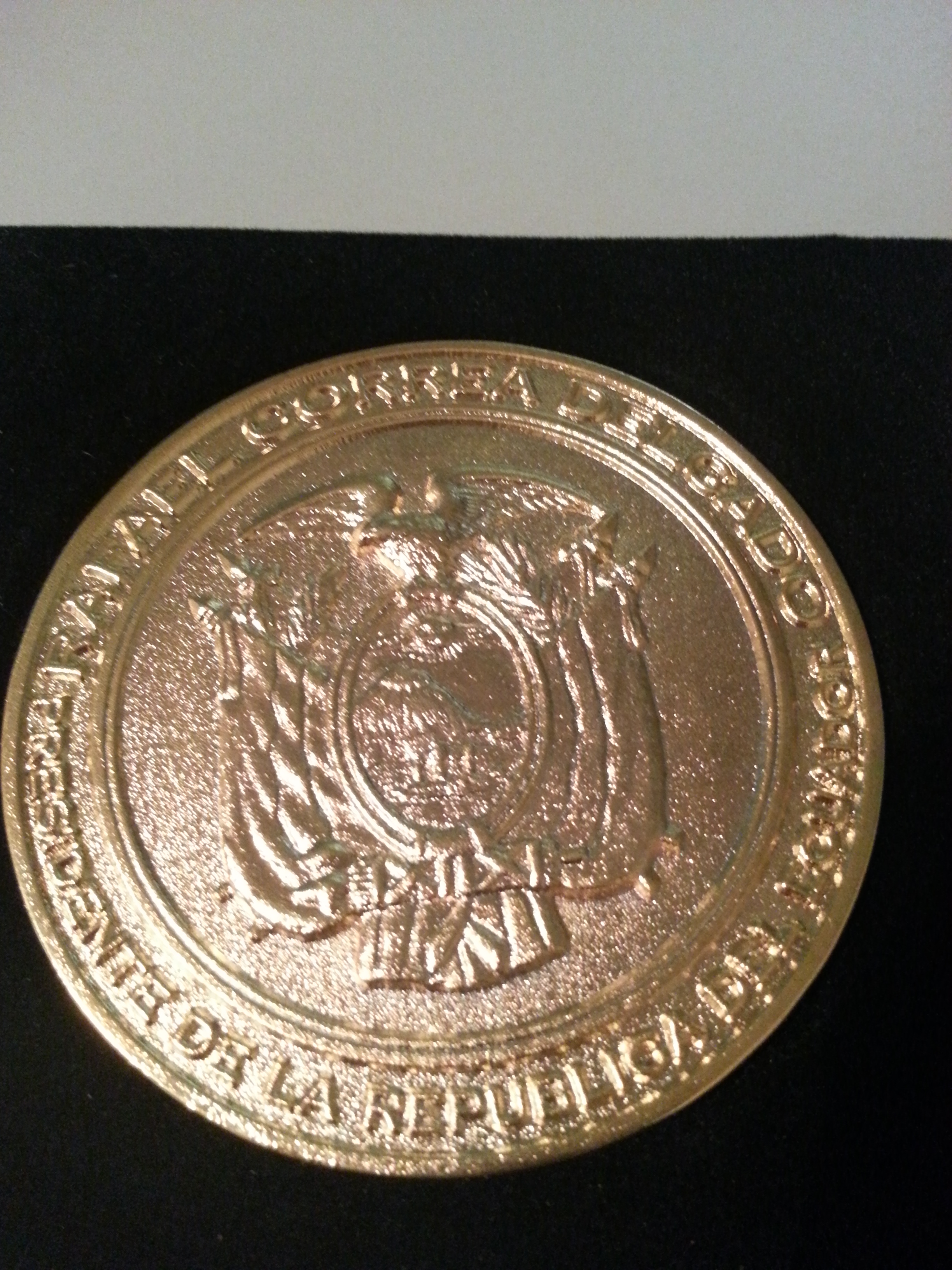 Medalha dourada, na frente um brasão ao centro escrito "Rafael Correa Delgado, presidente de la republica del Ecuador", e atrás escrito: o palácio de Carondelet ? 2013-2017. (Quito-EC, 03 a 08 jun. 2013)