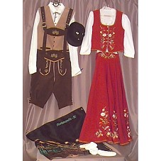 CONJUNTO DE ROUPAS TÍPICA DA OKTOBERFEST. CONJUNTO MASCULINO CONTENDO: CAMISA CREME DE MANGA COMPRIDA, COM FITA NO COLARINHO; COLETE EM CAMURÇA, NA COR OCRE; CALÇA CURTA COM SUSPENSÓRIO, EM CAMURÇA MARROM; MEIÃO BRANCO EM TRICÔ; E, CHAPÉU TÍPICO, EM FELTRO PRETO, COM ALGUNS BÓTONS FIXADOS. CONJUNTO FEMININO: ANÁGUA BRANCA; SAIA VINHO COM BORDADOS DE FLORES E FOLHAS; COLETE VINHO COM MESMO BORDADO, CAMISA BRANCA, DE MANGA 3/4, COM DETALHES DE RENDAS NAS MANGAS E COLARINHO. ACOMPANHA UMA TOALHA DE BANHO, COM FOTO DA PONTE HERCÍLIO LUZ, EM FLORIANÓPOLIS, ESTAMPADA NELA. TUDO ACONDICIONADO EM CAIXA FORRADA COM PAPEL COM MOTIVOS FLORAIS.