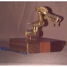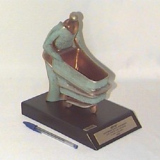 ESCULTURA (20X16X8 CM) FUNDIDA EM RESINA, PINTADA EM TONALIDADES DE VERDE, COBRE E DOURADO. FIGURA HUMANA EMPURRANDO UM CARRINHO DE SUPERMERCADO. FIXADA EM BASE (19X14X3 CM) METÁLICA PRETA, TENDO NA CANTO SUPERIOR DIREITO, PLACA COM ASSINATURA DA ARTISTA 'GLORIA CORBETTA' E, NA PARTE FRONTAL PLACA COM A INSCRIÇÃO 'ABRAS / SUPERMERCADISTA HONORÁRIO / LUIZ INÁCIO LULA DA SILVA / PRESIDENTE DA REPÚBLICA / 2003'.