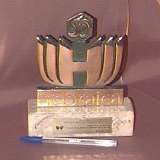 ESCULTURA (13X15X1 CM) COMEMORATIVA AOS CINQÜENTA ANOS DA HEBRAICA. SÍMBOLO DA INSTITUIÇÃO, ESCULPIDO EM PEDRA, COM ACABAMENTO EM METAL DOURADO POLIDO, TENDO NA PARTE SUPERIOR O NÚMERO '50', E, EMBAIXO, GRAVAÇÃO 'HEBRAICA'. FIXADA EM BASE DE MÁRMORE (16X6X4 CM). NA FRENTE DESTA, PLACA COM A INSCRIÇÃO 'HOMENAGEM AO 50º ANIVERSÁRIO DA ASSOCIAÇÃO BRASILEIRA 'A HEBRAICA' DE SÃO PAULO / LUIZ INÁCIO LULA DA SILVA / PRESIDENTE DA REPÚBLICA FEDERATIVA DO BRASIL / SETEMBRO-2003'. ATRÁS DA ESCULTURA, ASSINATURA GRAVADA 'ADINA'.
