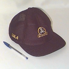 BONÉ EM TECIDO FURADO PRETO, COM BORDADO AMARELO. NAS LATERAIS, 'LULA' E ' 2º/2º GT'; NA FRENTE, 'CORSÁRIO' JUNTO COM DESENHO DE UMA CAVEIRA E DUAS ESPADAS; ATRÁS, A BANDEIRA DO BRASIL.