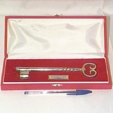 RÉPLICA DA CHAVE DA CIDADE DE CARTAGENA DE ÍNDIAS (COLÔMBIA) (18,5 CM) EM METAL DOURADO. ACONDICIONADA EM CAIXA (10X24,5X3,5 CM) FORRADA DE VELUDO VERMELHO. NA PARTE INTERNA, PLACA (4,5X1,5 CM) COM A INSCRIÇÃO 'REPLICAS DE LAS LLAVES DE CARTAGENA DE INDIAS / CARLOS DIAZ REDONDO / ALCALDE'.