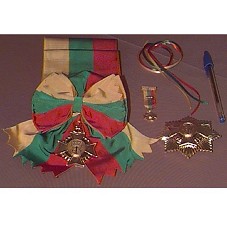 MEDALHA CÍVICA DE CARTAGENA DE ÍNDIAS, NO GRAU DE GRÃ-CRUZ, COMPOSTO POR: UMA FAIXA COM LISTRAS AMARELA, VERDE E VERMELHA, COM INSÍGNIA EM PRATA DOURADA 0900, TENDO AO CENTRO, MEDALHA COM DESENHO DE DOIS LEÕES SEGURANDO UMA CRUZ, COM UMA COROA NO TOPO, ATRÁS DA MEDALHA, QUATRO PONTAS DE UMA CRUZ, FECHADA POR UM CÍRCULO, ATRÁS A INSCRIÇÃO 'MECO 0900'; UMA MEDALHA COM MESMO SÍMBOLO, CIRCUNDADA POR RAIOS DOURADOS, TENDO ATRÁS, A INSCRIÇÃO 'MECO LTDA. / BOGOTA / MECO 0900'; E, UMA FITA COM LISTRAS AMARELA, VERDE E VERMELHA, PRENDENDO UMA MINIATURA DA INSÍGNIA. ACONDICIONADO EM CAIXA (15X31X7 CM) FORRADA DE VELUDO AZUL MARINHO.