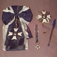 ORDEM DO RIO BRANCO, NO GRAU GRÃ-CRUZ, COMPOSTO POR: FAIXA AZUL COM LISTRAS BRANCAS E, PRESA NELA, INSÍGNIA EM FORMA DE CRUZ GREGA BRANCA DE BRAÇOS BIFURCADOS, TENDO AO CENTRO, ESFERA ARMILAR CIRCUNDADA POR ORLA AZUL-FERRETE COM A LEGENDA 'UBIQUE PATRIA E MEMOR'; NO REVERSO, IGUAL AO ANVERSO, COM ALTERAÇÃO NO MEDALHÃO PARA LISO, E NA LEGENDA PARA '1845 / 1912'; UMA MEDALHA COM MESMA INSÍGNIA, POSSUINDO AINDA RAIOS DOURADOS CIRCUNDANDO A CRUZ; UM BÓTON COM FITA AZUL E BRANCA; E, FITA AZUL COM LISTRAS BRANCAS POSSUINDO MINIATURA DA INSÍGNIA E DO BÓTON. ACONDICIONADO EM CAIXA (17,5X32X6,5 CM) AZUL, NO CENTRO DA TAMPA DESENHO DA INSÍGNIA EM DOURADO.