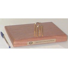 PLACA EM MADEIRA (19,5X26X3 CM), COM DOIS FIOS GROSSOS DE METAL DOURADO FIXADOS NA PARTE SUPERIOR CENTRAL, EM FORMA DE ARCO, E, NA FRENTE, PLACA (14X2 CM) METÁLICA DOURADA, COM A INSCRIÇÃO 'ESSO BRASILEIRA DE PETRÓLEO', E RESPECTIVO SÍMBOLO.